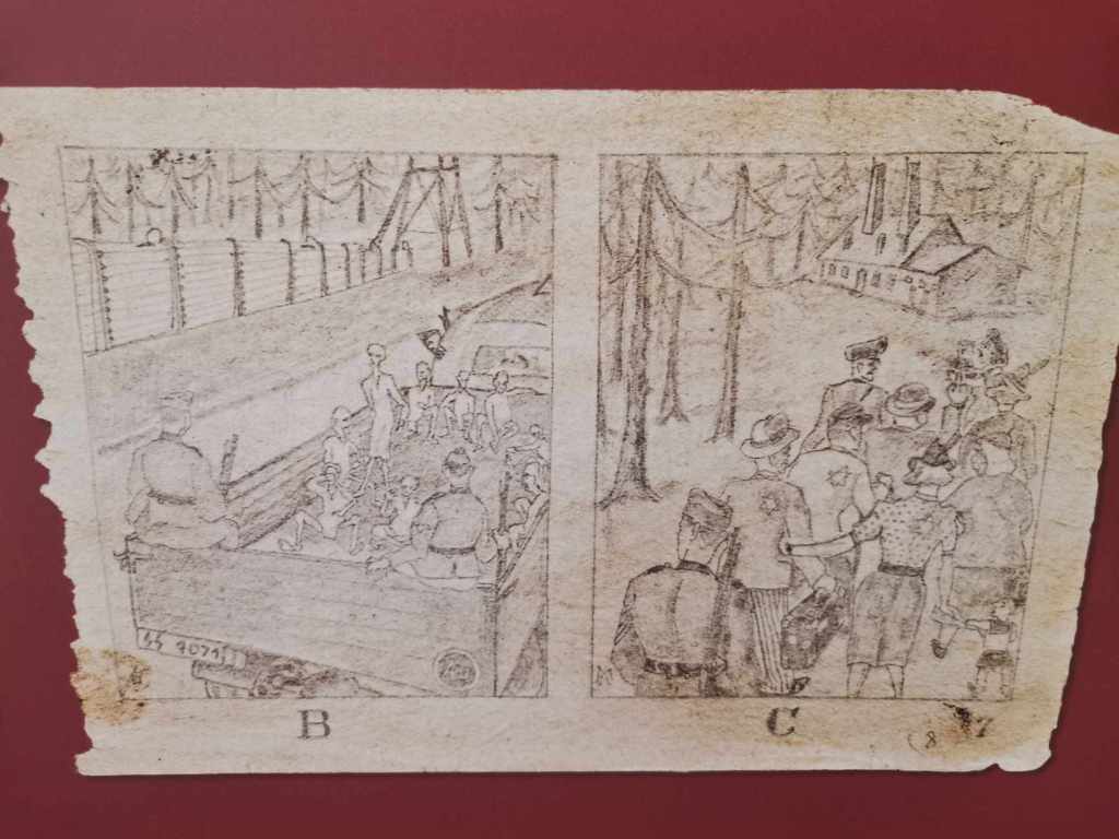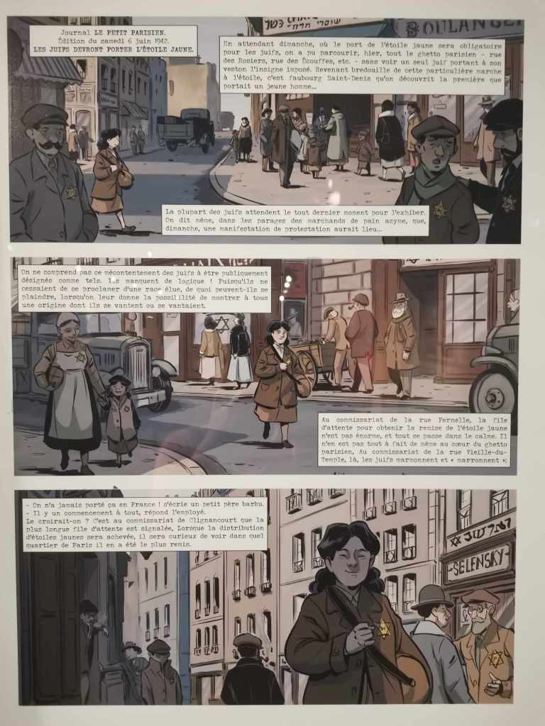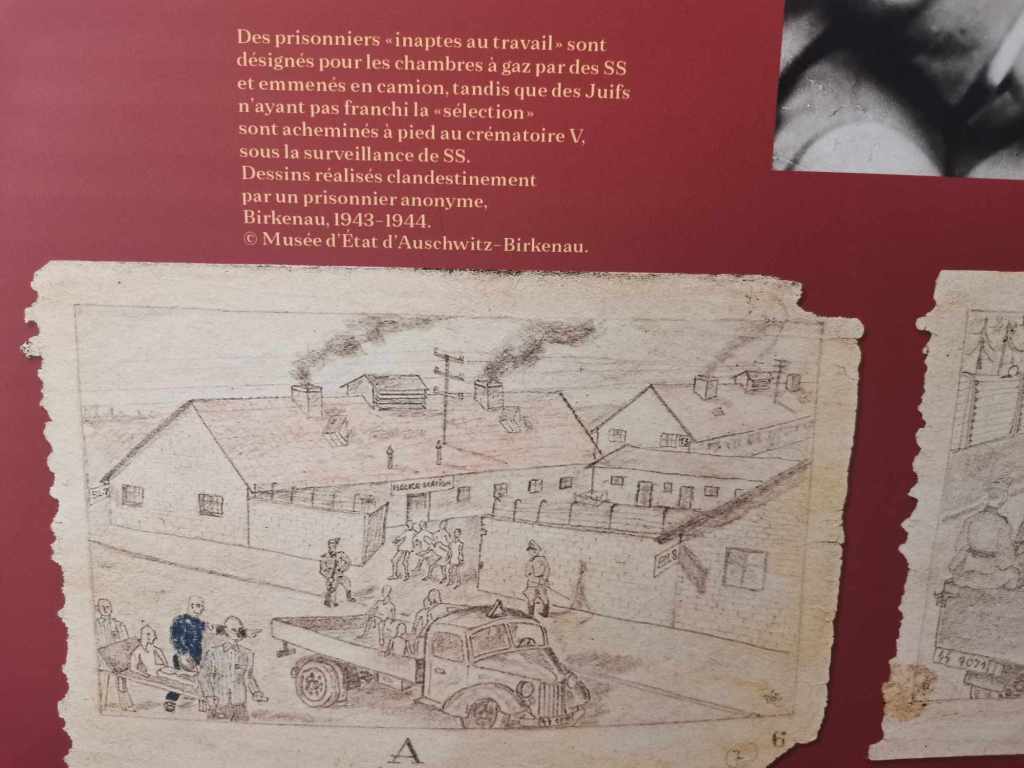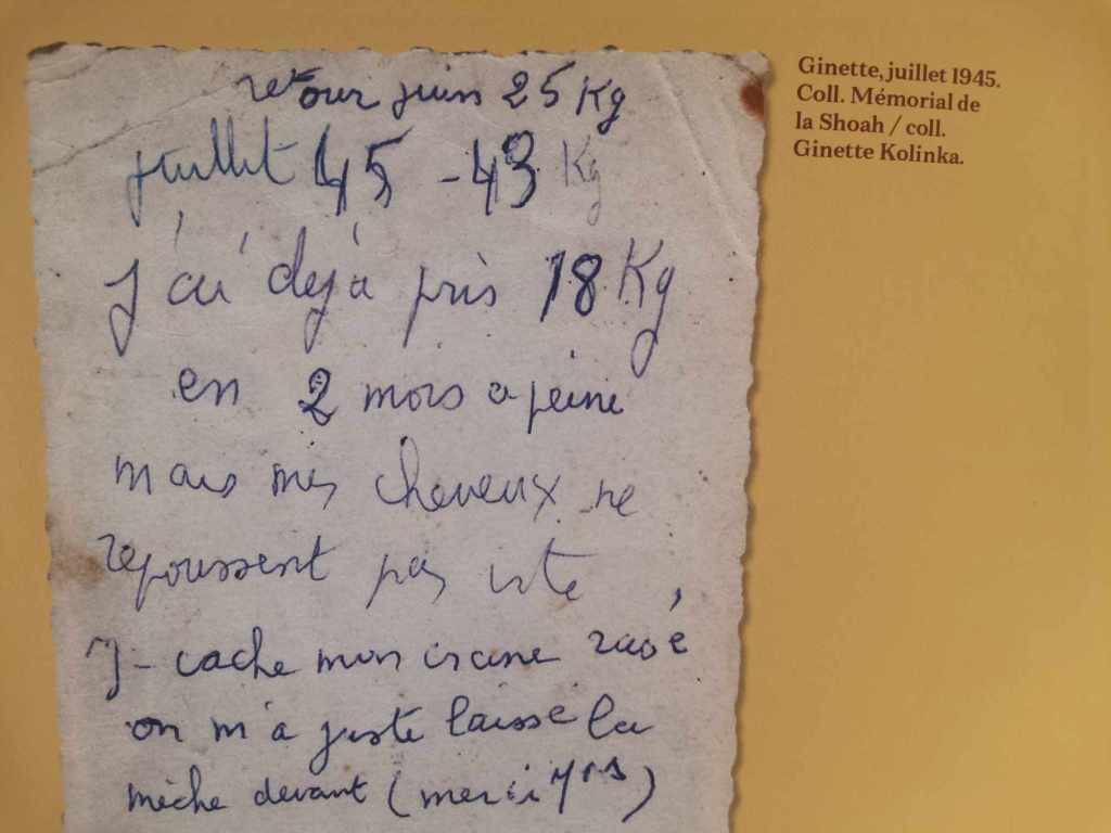 Plus que deux semaines pour courir voir l’exposition Ginette Kolinka, itinéraire d’une survivante d’Auschwitz, à la Maison de la bd de Blois. Cette exposition, qui rentre dans le cadre des « Rendez-vous de l’histoire, a la force de combiner panneaux réalisés par le Mémorial de la Shoah et planches de la Bd Adieu Birkenau, de Jean-David Morvan, Victor Matet, Efa, Cesc et Roger Sole, d’après le témoignage de l’ancienne déportée – aux Éditions Albin Michel. Grâce à une projection au fond de la salle, la voix de Ginette nous accompagne. Énergie exceptionnelle de cette témoin, âgée de 98 ans. Après des années de silence,l’importance de parler, de transmettre, de dire non à la haine, s’est imposée à elle. Et aujourd’hui, le devoir de mémoire s’impose, une fois de plus, à nous. Ne pas oublier, de la participationde la France à la déportation, à l’absence d’oiseaux dans le camp ; de la déshumanisation des prisonniers à leur extermination. En cela, chaque planche résonne, amplifiée par les autres médias rassemblés ici. Les dessins réalisés sur place, clandestinement, par différents auteurs, ou par les soldats britanniques à leur arrivée sont à ce titre édifiants. Tout comme le bout de feuille où notre héroïne écrit, une fois libérée : « retour juin. 25 kg. » car c’est le poids qui était le sien une fois revenue de l’enfer.
