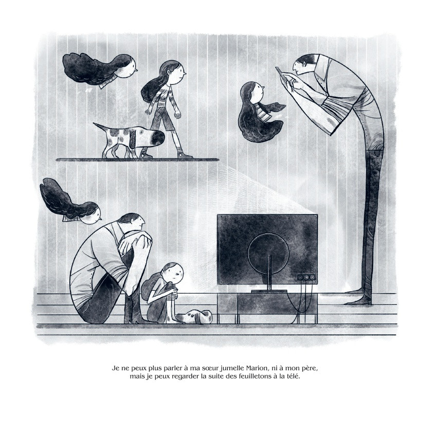 Pif paf pouf, on passe au suivant et les teintes pour celui-ci sont le noir, le blanc et le gris : Lou petit fantôme lunaire, parcourt les pages du livre et nous conte ses ennuis. Comme, elle bataille durement avec sa solitude, la fillette taquine les esprits. Un murmure, comme un appel, la pousse dans le ciel et elle retrouve « Wafi ». Les circonstances font que l’animal et l’humaine se comprennent parfaitement, il peut donc lui demander son aide pour secourir Marion.