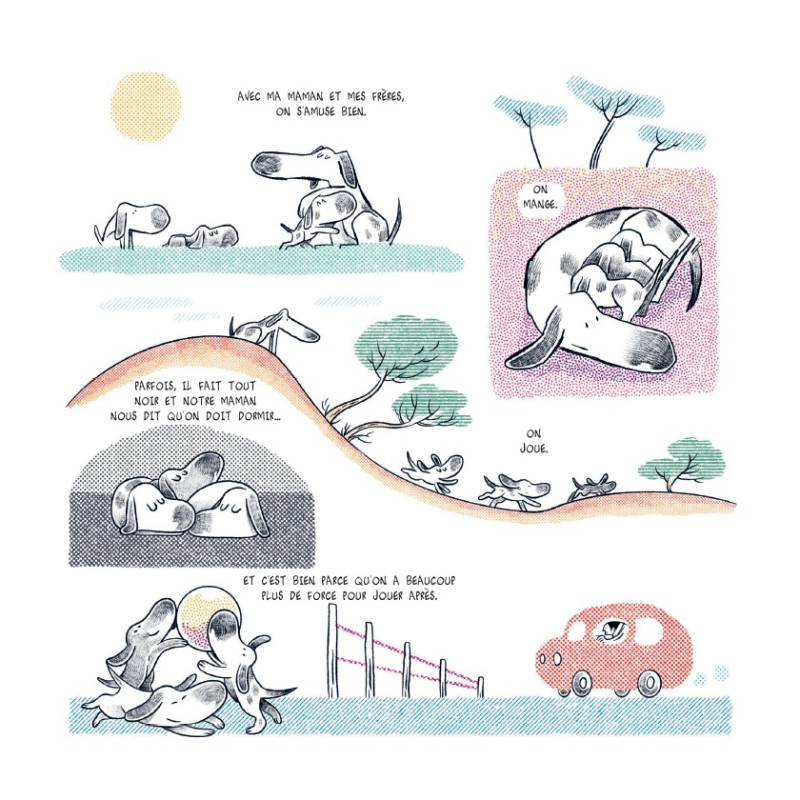 Deuxième volet et second style graphique : Nous voilà en compagnie de « chien », le toutou maboul qui était à la poursuite de Victor. Vous suivez ? Une petite boule de poils qui vit avec sa maman et ses frères et sœurs. Que la vie est belle. Un jour on l’emmène, il se retrouve avec un géant et deux petits modèles, des jumelles. Le grand n’est pas bien sympa, mais les plus jeunes adorent jouer avec lui. Je vous passerais les détails des mésaventures des frangines, pour en revenir au plus important. Le canidé qui tournicotait bruyamment autour du bambin, voulait seulement attirer son attention, il avait vivement besoin de son aide.