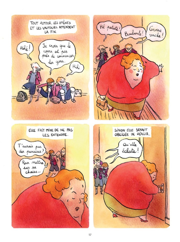 C’est un récit chapitré subtil que Vincent Zabus nous propose ici chez Dargaud, un album accessible et touchant que l’auteur de théâtre a concocté avec malice. Il s’adresse aux bambins mais parvient également à interpeller la part d’enfance cachée en chacun de nous. Il campe des personnages attachants et faillibles. La demoiselle est douce, enveloppante et forte. Le garçonnet est empathique, attentionné et lâche. Il en résulte une intrigue profondément humaine et riche qui aborde mine de rien un paquet de sujets, la grossophobie, la boulimie, la relation frère sœur, élève enseignant, l’amitié et la confiance en soi. Les métaphores animalières y sont percutantes et amusantes.