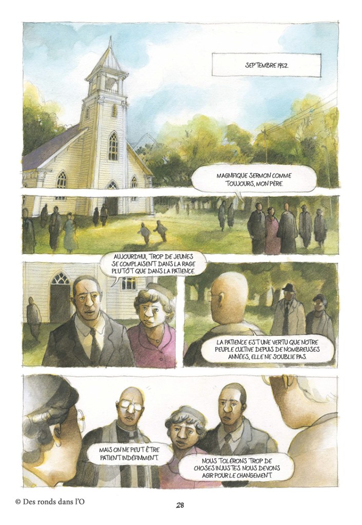 L’échange nocturne entre le jeune homme et le vieux chauffeur, en forme de maillon passé-présent, est illustré en aquarelle avec un effet de couleurs plutôt vives en halo, les lumières de la circulation et de la ville à travers une pluie fine ; les souvenirs d’Aloysius, le taximan, davantage en sépia et tons neutres. On circule dans ces planches aux traits aussi doux que les propos sont forts avec aisance, jusqu’à ce 3 novembre 1956 où la Cour Suprême s’est enfin prononcée pour la justice et l’équité, jusqu’à ce que le jeune homme descende du taxi… Le contraste entre la légèreté du trait et de la colorisation et le propos dense, fondamental, fonctionne extrêmement bien pour embarquer le lecteur.