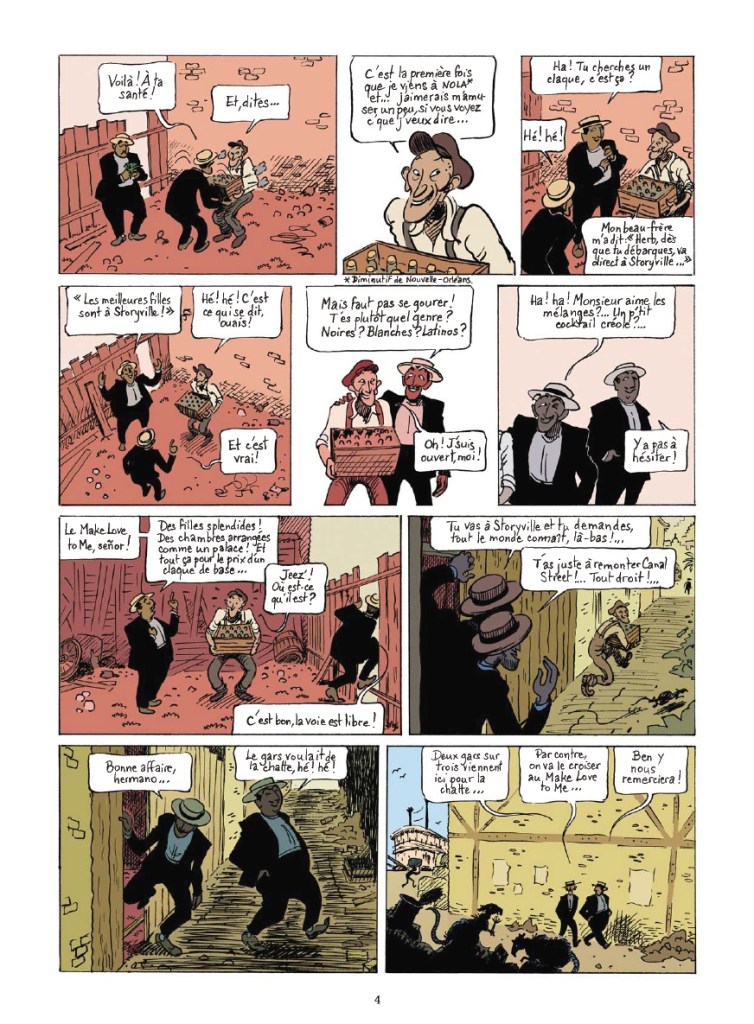 Bienvenue à Storyville, le quartier rouge de La Nouvelle-Orléans, à l’époque de l’Amérique puritaine ! C’est dans cette ville que grandit l’héroïne Santa, adolescente à la curiosité particulièrement aiguisée. Que vont faire ses frères au « Make love to me » ? Comment travaillent les filles de la maison close, et finalement, le sexe est-ce pareil que l’amour ? Qui est cette Lala, maîtresse de maison qui protège toutes ses filles, peu importe la couleur de leur peau ? Et qui se cache derrière le mystérieux « Vicomte », propriétaire des lieux décrit comme pervers ? La curiosité de Santa l’emmène jusqu’à s’introduire au « Make love to me », à se lier d’amitié avec ses prostituées, et même à élaborer progressivement avec elles une école du plaisir, sous-titre de la BD éditée par Glénat. Et c’est dans cette dernière partie que l’ouvrage scénarisé par Lauriane Chapeau et dessiné par Loïc Verdier s’avère le plus intéressant, et même pédagogique, autour de la question du plaisir féminin. Car dans le contexte d’une Amérique puritaine, les hommes envisagent peu d’apporter du plaisir à leurs épouses, et les femmes méconnaissent leur corps et ses mécanismes, au contraire des filles du « Make love to me » qui viendront accompagner les un•es et les autres dans leur exploration des mystères du sexe. La fraîcheur apportée par le personnage de Santa, jamais en manque d’idées audacieuses mais toujours respectueuses, qui elle aussi progresse dans son histoire intime et amoureuse, n’est pas pour rien dans le plaisir pris à lire Storyville. Lecture conseillée à partir de l’adolescence.