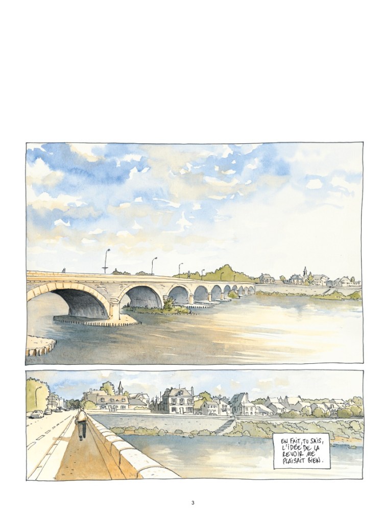 Dès lors, ses paysages et ses humeurs sont le fil rouge de la trame graphique : de jour comme de nuit, sous le soleil et les éclairs, aux différentes heures, et avec ses différents visiteurs, oiseaux, renards, chevreuils… Tous les motifs singuliers de ce paysage habité, à l’identité unique, sont également dessinés avec soin : arbres travaillés par les hautes eaux, bâti de tuffeau et d’ardoises, ponts, bateaux à fond plat, cyclistes et – malgré le danger – baigneurs… Les aquarelles sont magnifiques, lorsque du mélange des couleurs et de l’eau jaillissent des accidents, que le ciel se constelle d’étoiles, que les ombres s’allongent… Le gaufrier s’adapte et les plans sont impeccables, pour offrir des cases grand format où le regard peut plonger dans les eaux murmurantes, où s’ouvrir au ciel… Chacun pensera reconnaître un lieu qu’il chérit, car le lit de la Loire offre une remarquable unité, une valeur universelle exceptionnelle que l’on ressent pleinement ici.