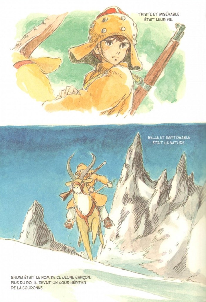 Hayao Miyazaki se réapproprie le conte populaire tibétain «Le prince qui fut changé en chien» auquel il ajoute un traitement homérique. Le périple du héros se métamorphose en trame principale, le protagoniste connaît le chemin à emprunter mais la destination finale lui est inconnue. L’album est fantastique tant par le fond que par la forme, l’ouvrage tient plus du roman illustré que de la bande dessinée traditionnelle. Les phylactères et dialogues sont quasiment inexistants. Le texte récitatif se noie à l’intérieur de l’esquisse et la peinture à l’eau dans le but de prendre la pleine mesure de l’imagerie qui défile sous nos yeux. Le lecteur perçoit des thématiques récurrentes que le maître développera sur l’ensemble de sa filmographie, Nausicaä de la vallée du vent et Princesse Mononoké en tête. Miyazaki-sensei en profite pour transmettre ses préoccupations ainsi que ses opinions grâce à un équilibre subtil. L’histoire est abordée de manière organique et traitée intelligemment. L’auteur développe une approche philosophique pour contrebalancer une violence omniprésente. L’action peut avancer calmement mais aussi accélérer subitement, l’émotion passe par les personnages et leurs mésaventures. Le Voyage de Shuna est une longue fresque reliée imaginaire qui alerte, pousse à la prise de conscience et sensibilise. Elle prône l’espérance, le juste combat et l’héroïsme. Le récit culmine jusqu’à une conclusion bouleversante comme à l’accoutumée chez Miyazaki. L’œuvre n’est autre qu’une route semée d’embûches à la fois enrichissante et mélancolique, autant émouvante que dramatique.