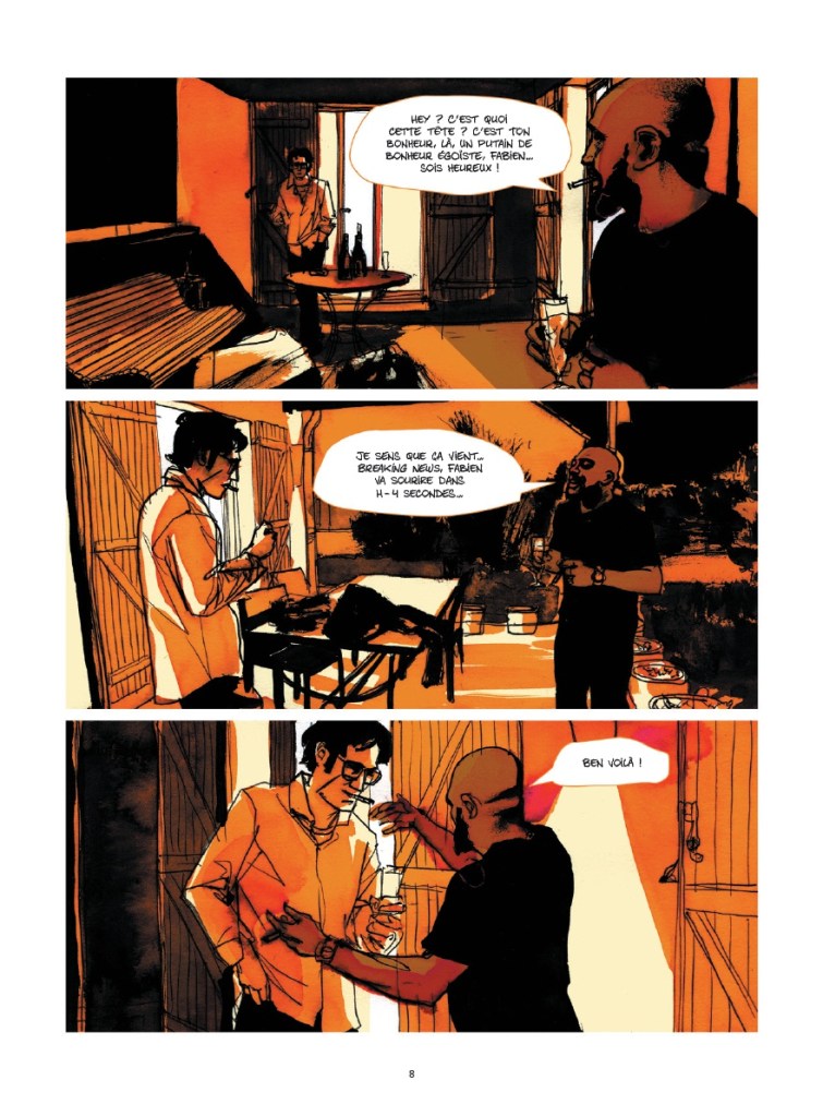 Au sein des pages, monochromes, déclinant des tons chauds, l’illustrateur joue remarquablement sur les éclairages, équilibrant aplats de couleurs, surfaces laissées claires et noir d’encre. Ambiances nocturnes propices à la divagation des pensées, aux gestes automatiques. Le coup de pinceau se fait par moment fuyant et rugueux, à d’autres moments doux et irrégulier, en lavis laissant apparaître des tâches. Les traits, présents et précis, parfois nerveux ou anguleux, nous emportent. L’édition, généreuse, en 224 pages, permet au dessinateur de détailler les expressions des visages, et au lecteur de s’immerger aux côtés du narrateur. Les plans rapprochés sont nombreux ; le découpage finement travaillé, varie bandes horizontales, grandes cases carrées touchantes voire bouleversantes, et planches en 3 plans. L’ensemble a une qualité cinématographique remarquable.