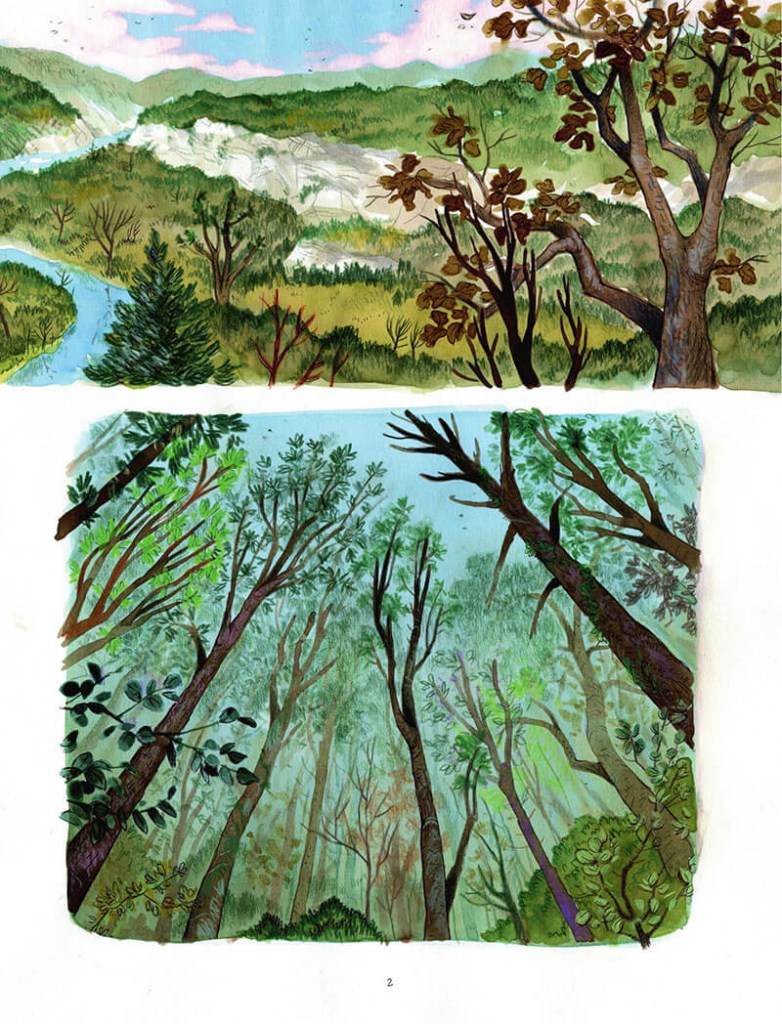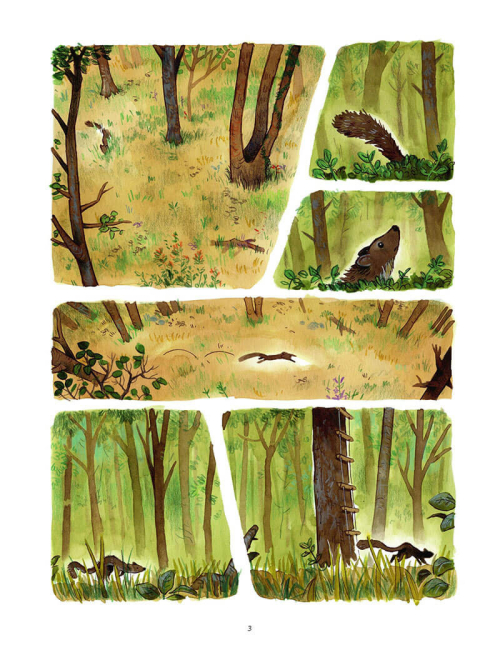 Par ses sublimes déclinaisons de couleurs naturelles, ce livre nous immerge dans les ambiances forestières : odeur d’humus en sous-bois, brume enveloppant les troncs, visiteurs discrets, mais nombreux… Le dessinateur nous offre de fabuleuses planches, à l’aquarelle douce et précise : pleines pages saisissantes, de jour comme de nuit, et très belle liberté du gaufrier, où les cases, sans contour, s’arrondissent, s’encadrent de feuillages, laissent la place à des objets dessinés à la façon d’un carnet de bord, avec un beau souci du détail. Du couteau à la loupe de botaniste en passant par chaque composante d’un bourgeon, on prend le temps de regarder les éléments avec attention… Et alors la nature reprend ses droits, des fourmis cheminant au coin d’une page au remarquable vol des oies. La libellule, aux extraordinaires ailes évanescentes, semble sortir de la page. Le dessin apporte force et calme, on y perçoit la rugosité du bois, l’humidité des jours de pluie, la vigueur d’un printemps retrouvé. Si j’osais, je dirais « à tomber », mais la construction est solide !