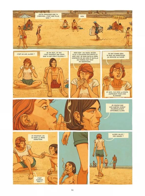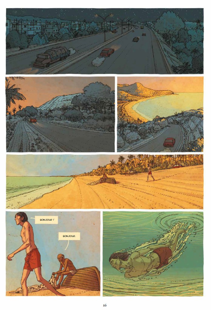 L’atout majeur de cet album ce sont ses couleurs numériques et le choix subtil de tons sépia, jaunes, ocres, des nuances d’ orange, une palette très chaude qui correspond exactement aux décors, aux plages, aux routes de terre et aux paysages arides d’une contrée magnifique.