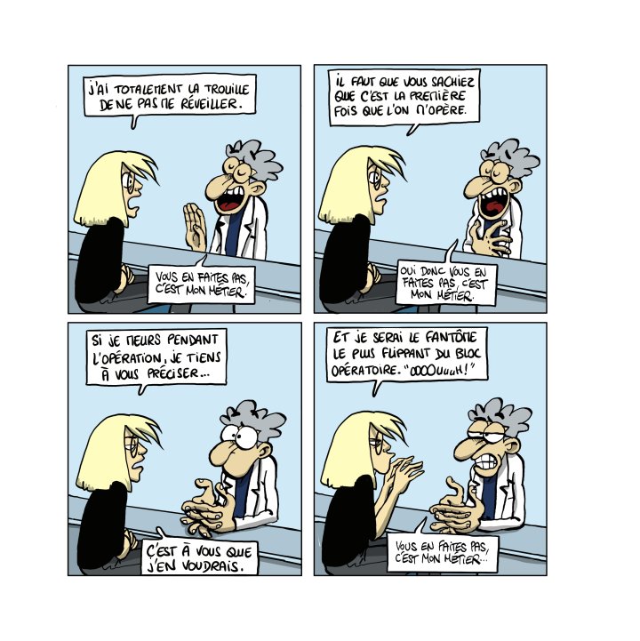 Il y a son compagnon, calme olympien apparent mais qui lui colle des étiquettes « Fragile » partout ; sa mère, présence rassurante et soutien inconditionnel ; sa copine, tacle complice efficace pour se dire qu’on s’aime sans se dire qu’on s’aime ; le copain gentil en mode « ma pauvre… » à qui t’as envie de faire bouffer son kleenex ; le personnel médical, du grognon franchement désagréable à l’équipe fantastique, douce et bienveillante, qui met à l’aise dans ces moments où clairement on ne l’est pas… Les inconnu(e)s aussi, croisé(e)s au détour des couloirs d’hôpitaux et des salles d’attente, leurs paroles empathiques et leurs sourires rassurants…
