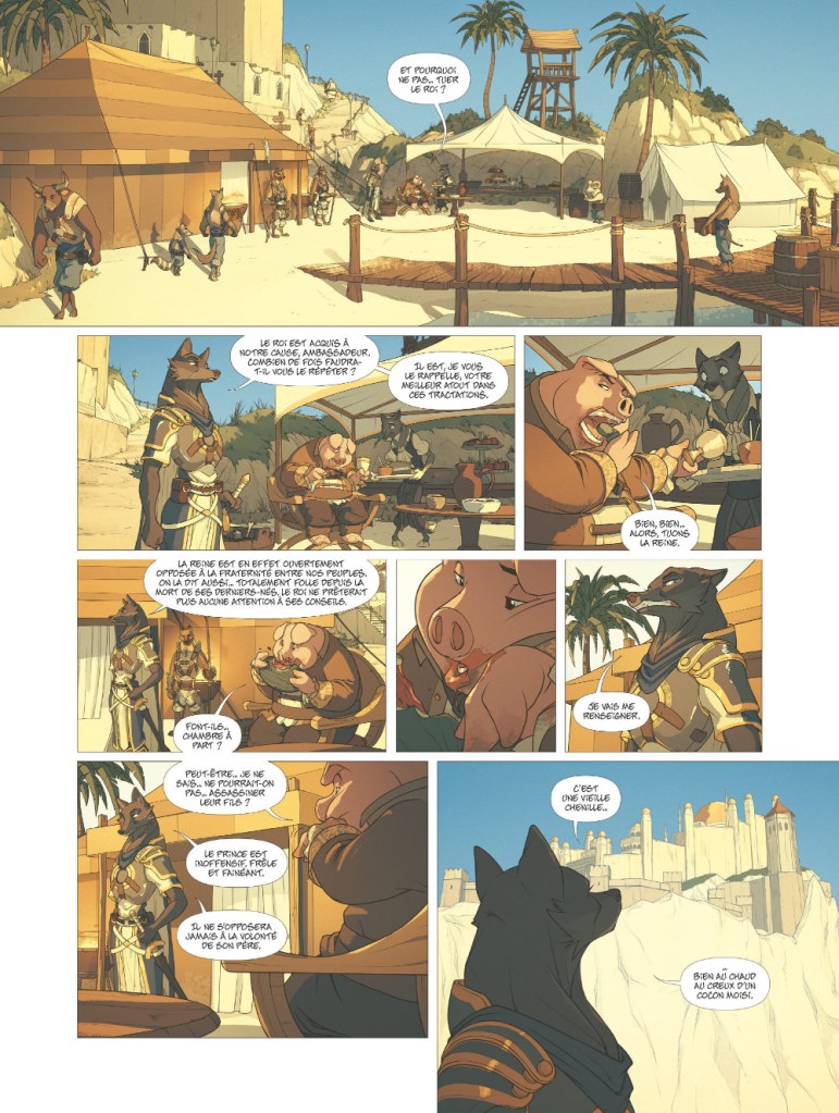 Les bédéistes nous guident dans le royaume des lions, un empire sur lequel règne un suzerain vieillissant que beaucoup aimeraient voir tirer sa révérence. Le vieux lion est attaché à la paix, à la fraternité entre espèces mais il y a chez les félins, des intrigants désireux que son fils lui succède, que la progéniture royale tue son géniteur. Malgré les encouragements de sa mère, le prince s’y refuse dévoilant un tempérament qui n’a rien de celui d’une bête sauvage. A l’inverse de son frère aîné, il semble animé d’une sagesse qui résulte peut-être de ses nombreux voyages. Nous sommes à la veille d’une déclaration du monarque, un moment solennel déterminant pour lequel des délégations de chaque royaume ont fait le voyage.