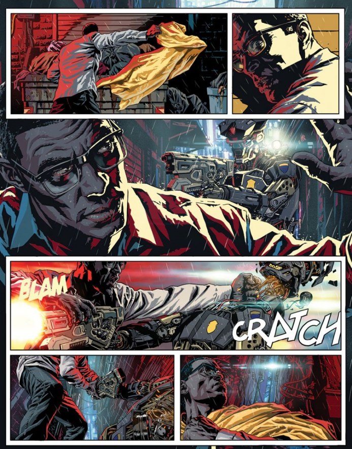 Mattson Tomlin vient du cinéma et de la télévision. Il baigne dans la culture comics et a rédigé des adaptations sur grand écran de bandes dessinées connues comme Fear Agent, Memetic ou BRZRKR. Il signa aux côtés d’Andrea Sorrentino l’honorable mini-série Batman : The Imposter pour DC Comics. Le présent récit est sans concession, il plonge le lecteur à l’intérieur d’une boucle de Moebius science-fictionnelle violente à haute vélocité où il n’est question que de vendetta aveugle ainsi que de ses répercussions. Le scénariste donne vie à une première co-création indépendante hargneuse et sulfureuse. Les dialogues et pensées des personnages sont concis, ils vont droit au but. L’économie de mots permet de laisser le champ libre à l’action, la réflexion et l’interprétation visuelle choc déployée par Bermejo. Cette technique favorise une symbiose entre le conteur et son illustrateur.