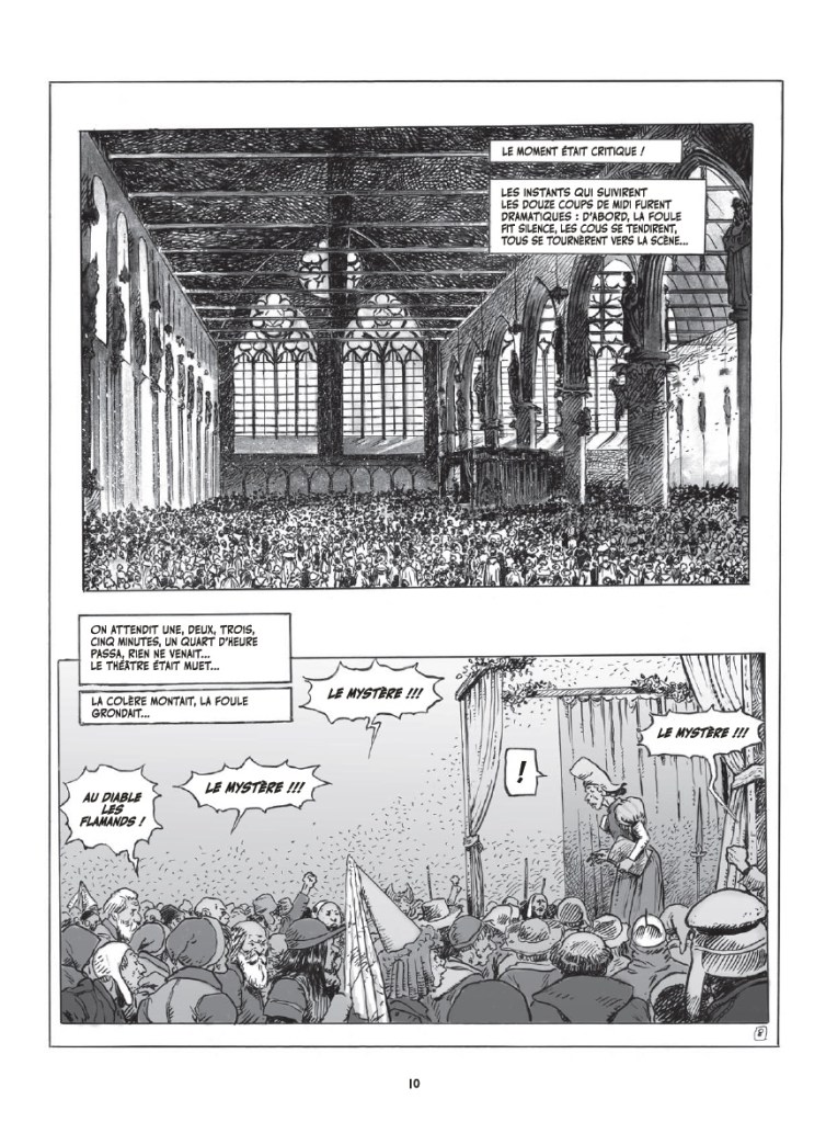 Impossible de caler ici une exégèse de l’œuvre colossale de Victor Hugo. Néanmoins, quelques repères peuvent être utiles. En ouvrant cette bande dessinée vous vous retrouverez plongés dans Paris à la fin du XVème siècle, un Paris médiéval donc et sans concessions, sombre, violent, marqué par l’obscurantisme, avec pour axe central et décor principal, la cathédrale. Jamais très loin du Paradis ni de l’Enfer. Vont graviter autour d’elle notamment Quasimodo, le monstrueux sonneur de cloches ; Claude Frollo, l’archidiacre concupiscent et prêt à tout ; Phoebus, le capitaine, belle gueule abject ; et bien sûr Esméralda, l’envoutante danseuse… A travers eux, c’est la fatalité qui préside au destin de chacun que l’on interroge. Ce sont les méandres de l’âme humaine que l’on approche ; ses travers et ses déraisons, ses lumières et ses grâces, ses ambivalences amoureuses et ses passions dramatiques, parfois grotesques jusqu’au sublime…