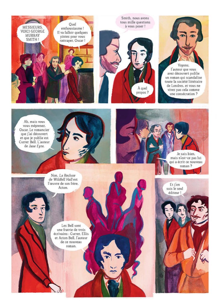 Pour mettre en perspective le mouvement féministe, il est intéressant de se rappeler des normes héritées du XIXème siècle et qui ont longtemps perduré : les femmes étaient soumises à leur mari. Pas question de quitter un mari violent, ni même d’écrire un roman dont ce serait le scénario. Pourtant, chez les trois sœurs Brontë soufflait un fort vent de liberté, qui les a conduit à écrire des textes subversifs et précurseurs, quitte à user d’un ingénieux subterfuge pour être publiées. Admirative de ces écrivaines, l’autrice Paulina Spucches a réalisé, en visitant la maison où elles avaient vécu, qu’Anne était tout autant romancière que ses aînées (dont l’une est l’autrice des Hauts de Hurlevents, un des plus grands romans britanniques). Il n’en fallait pas plus à la talentueuse Franco-Argentine pour vouloir lui rendre justice en lui dédiant une bande dessinée, poursuivant ainsi sa collaboration avec Steinkis, qui a également édité son premier album. Portrait d’une société victorienne patriarcale, la bande dessinée Brontëana »n’est pas une simple biographie de la benjamine. Elle nous transporte, à chaque planche entièrement peintes. En effet, celles-ci sont superbes, surprenantes d’époustouflantes couleurs vives et denses, dans un style entre fauvisme et expressionnisme rare dans le neuvième art. Dans cet univers se mêlent la magie des grands espaces et des landes, les histoires imaginaires et un destin hors norme, malgré un quotidien parfois très dur. L’album, au scénario riche, propose en supplément de superbes pages annexes, très complètes : postface, carnet de recherches graphiques, chronologie, bibliographie, reproduction de dessins et lettres des sœurs.
