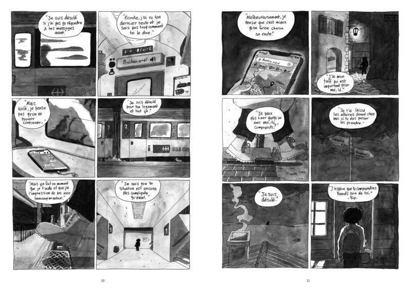 Le duo a composé cet album d’illustrations en noir et blanc, ce qui lui donne un air joliment « retro ». Cela tombe bien, Johanna Spyri a publié les deux premiers romans du personnage mythique, entre 1880 et 1881. Leur style est diamétralement différent. Dans les traits d’Elmax, j’ai distingué une similarité avec l’artiste que j’apprécie énormément, Peggy Adam. Ce n’est de loin pas une critique, mais tout comme chez l’autrice, les individus sont renfrognés et ses paysages authentiques et soignés. Ploy, utilise la gravure et de l’encre de chine. Les panoramas ont un côté flou, comme s’ils avaient été élaborés au fusain, alors que les humains, le plus souvent, sont construits avec une ligne plus nette et simple. Le mélange est harmonieux et un tantinet naïf.