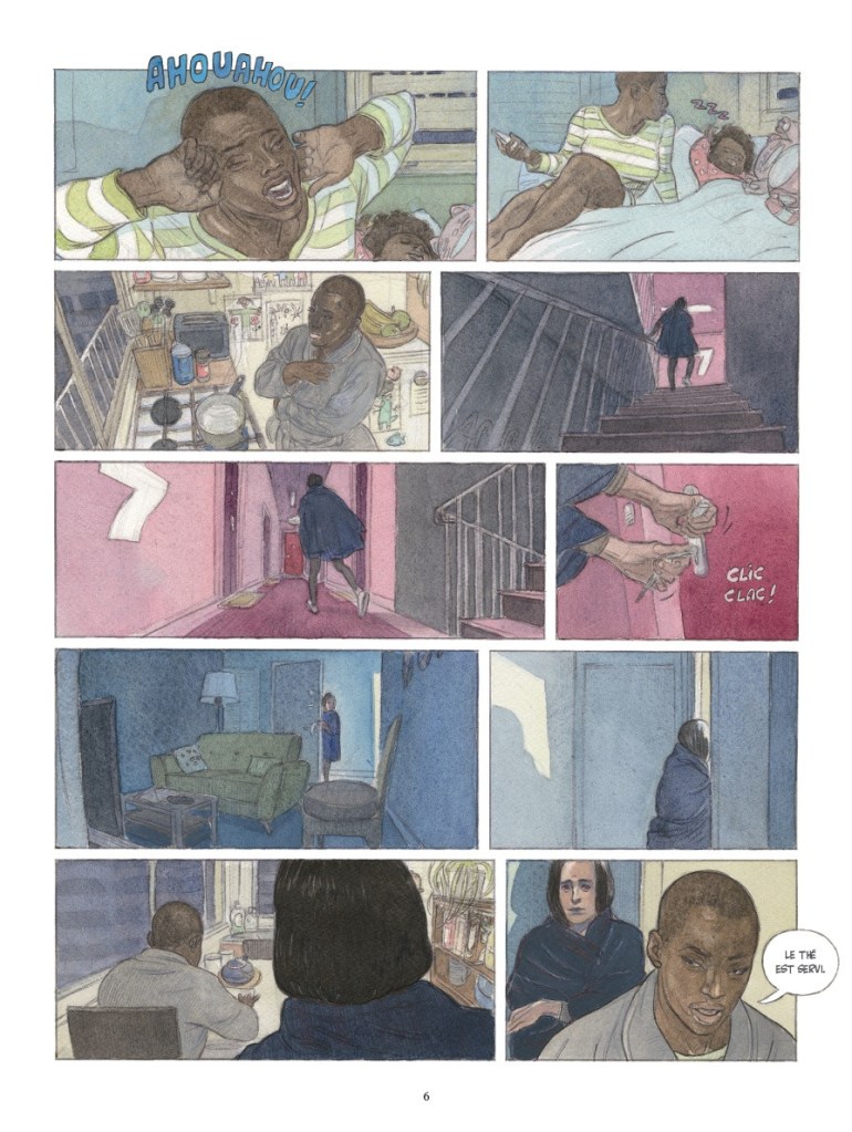 Il y a beaucoup de couleurs, on en prend plein les yeux grâce à de nombreux mélanges. On perçoit de la douceur du bleu, de l’orange, du jaune un joli mixte d’aquarelle, d’acrylique et de gouache. Même notre héroïne Africaine n’est jamais tout à fait noire, le bédéiste s’amuse encore et toujours livrant un dessin à la fois dynamique, intense et vivant.