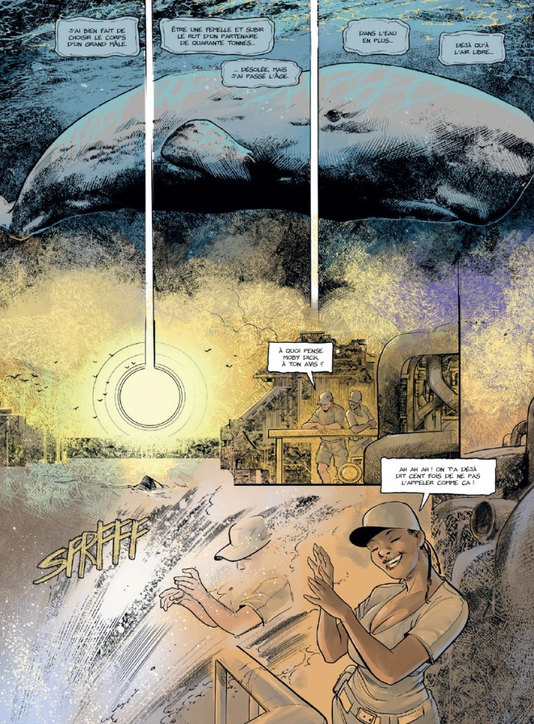 Peut-on encore être surpris graphiquement par un album d’aventure et d’action ? Oui, quand le dessinateur a un vrai style qu’il décline avec brio, nous offrant un jeu de case soigné, des perspectives abyssales, des contre-plongées qui prennent tout leur sens à des lieux sous la mer… Et surtout, il y a ces peaux et fonds de décor texturés, hachurés, donnant de l’épaisseur aux plans, témoignant de l’ histoire riche des cétacés marqués par les cicatrices de la vie. Les cases ne manquent pas d’éclaboussures, le végétal semble éclore en mille bulles, le trait réaliste est rehaussé de taches abstraites, de griffes, comme pour nous rappeler que la vie n’est pas lisse mais rugueuse, pleine d’aspérités, de contradictions, d’épreuves. Les explosions spectaculaires sont aussi au rendez-vous. La technologie de pointe se mêle à la nature océanique la plus sauvage. Dans les sanctuaires de glace de l’Antarctique, l’auteur joue avec délice sur le noir des profondeurs et l’harmonie des couleurs, jusqu’à ce qu’apparaissent d’extraordinaires filaments de lumière…
