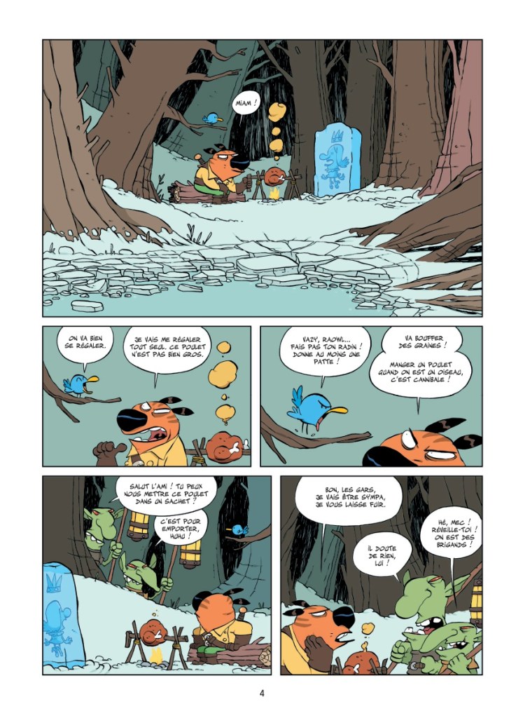 Je l’avoue, je suis en totale adoration devant l’esprit brillant et les biscotos de cette créature bestiale. Vous vous doutez bien, le trublion n’aurait pas pu voir le jour sans la finesse et le doigté de l’ami Tébo. Nous savons tous à quel point l’artiste est délicat et romantique. Lorsque nous suivons les péripéties de notre boule de poils, nous y décelons une ribambelle de similitudes avec son créateur. Mais son personnage ne serait pas ce qu’il est, s’il ne l’avait pas imaginé sous cette forme. Ce qui fait également l’attrait des titres du Normand, c’est incontestablement l’originalité de ses mises en page. Loin de s’enfermer dans des cases, il aime s’amuser et il nous propose des planches où les instigateurs virevoltent d’un coin à l’autre de la feuille. C’est un parcours digne d’un jeu vidéo, dont le dynamisme est décuplé par cet effet cartoon. Parfois certaines réalisations sont hyper sobres, dénuées de fond, alors que suivent des histoires aux détails foisonnants de détails et à la lecture virevoltante comme un grand huit. Estomac sensible, abstenez-vous ! On en ressort ébouriffés, la caboche à l’envers, c’est marrant.