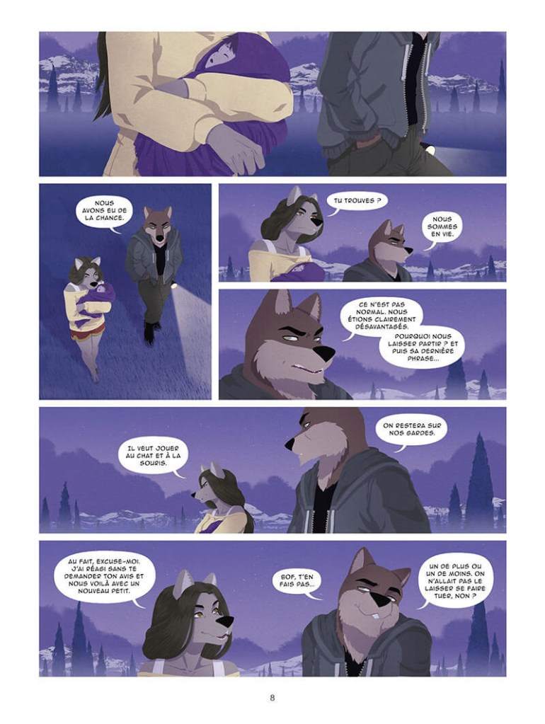 L’artiste livre un dessin et une colorisation numérique très accessibles, des ambiances renouvelés qui accompagnent parfaitement une narration rythmée ou se succèdent pics de tension et phases de vie. Dans ce divertissement qui ne manque pas d’atouts, les belles illustrations ont une place de choix. Les personnages sont soignés et astucieusement composés.