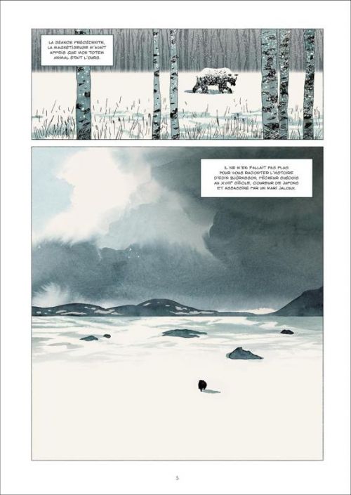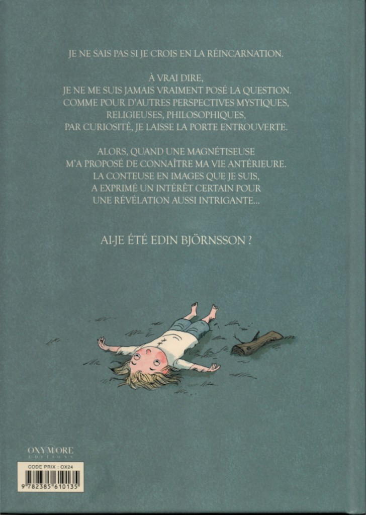 J’ai découvert les exquises planches originales d’ Edith à la Maison de la bd, à Blois, à l’occasion d’une chouette exposition : la maison jaune, en 2022. Cet événement venait mettre en lumière le talentueux travail de l’artiste, récompensée par le prix Grand Boum en 2021 pour l’ensemble de son œuvre. Ou, plutôt, je l’ai redécouverte, car j’avais déjà fait l’acquisition 10 ans plus tôt de La Chambre de Lautréamont , titre incroyable puisque que formidable réinterprétation du premier roman graphique, publié en 1874. Vous l’aurez compris, Edith est la promesse de surprises et de qualité. La bande dessinée Moi, Edin Björnsson aux Éditions Oxymore, ne fait pas exception à la règle. Le sous-titre en dit long sur l’originalité de l’histoire : « pêcheur suédois au XVIIIème siècle, coureur de jupons et assassiné par un mari jaloux. » Nous voilà transportés il y a pas moins de 255 ans, l’exotisme des noms et des langues s’ajoutant au grand saut temporel. Pour autant, les sujets, philosophiques, ne manquent pas de modernité. L’histoire pourrait être un drame si elle n’était pas si malicieuse. Edin Björnsson s’avère un délicieux anti-héros. Les dessins allient puissance du crayonné noir et douceur d’aquarelles lumineuses. Même la couverture, vert turquoise, sort du lot, avec une mise en page décentrée, laissant place avec classe à un liseron en trame de fond. Sous sa peau d’ours, à l’image de ce joli végétal fugace, notre protagoniste serait-il aussi fragile qu’avide de liberté ?