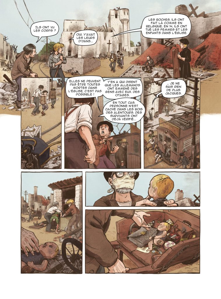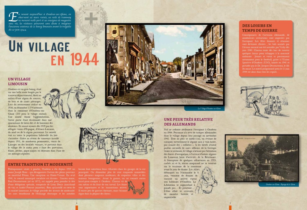Philippe Tomblaine qui est également enseignant nous présente brillamment le contexte, les acteurs, le massacre et son organisation millimétrée. Il accorde une place de choix aux témoins directs de ce drame ce qui est tout à fait pertinent. Et puis, il évoque les suite de cet événement bouleversant de la seconde guerre mondiale, les conséquences et l’importance du maintien des ruines dans l’état pour les générations futures. Il a rédigé des textes éclairants, accessibles qui introduisent toujours une documentation choisie avec soin. Elle est composée de photographies, croquis, plans et documents variés qui facilitent la compréhension et ont toujours pour but de sensibiliser un large public.