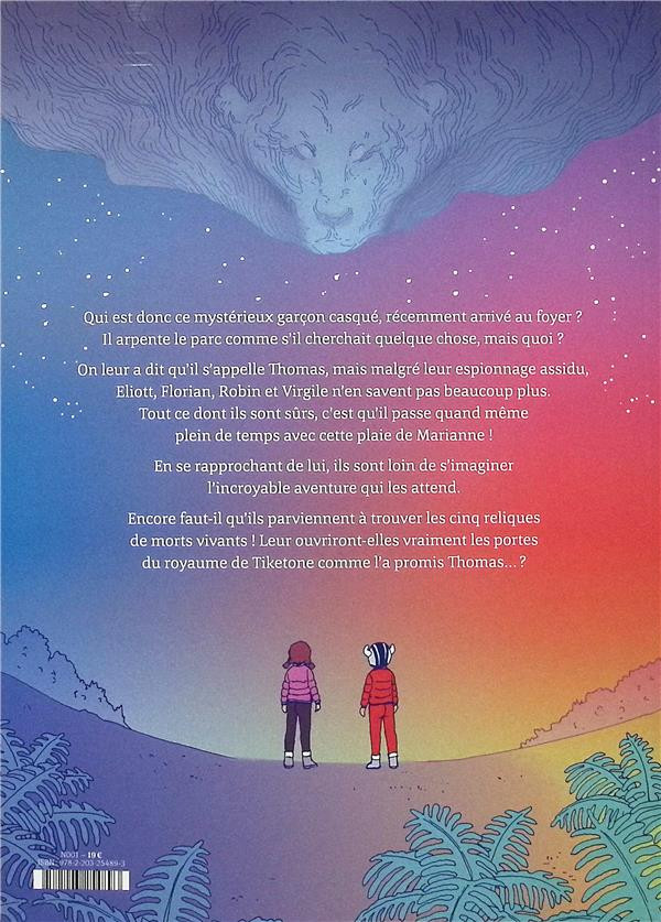 Un garçon énigmatique est arrivé au foyer. Traumatisé par l’accident de voiture qui a coûté la vie à ses parents, il ne parle pas, mais émet des bruits étranges. La parole finit par revenir, et un groupe d’amis se crée autour du jeu de Tomas : trouver cinq reliques laissées par cinq gardiens : une coquille d’escargot, une plume de merle, et trois autres, plus difficiles à trouver. Il faut dire que sa sœur, juste avant de disparaître soudainement lors de la chute du véhicule, affirmait la présence de fantômes et d’une porte à franchir. La quête serait-elle plus sérieuse qu’elle n’en a l’air ? La recette scénaristique est très bonne : une pincée d’humour pour dédramatiser la situation, une bonne dose d’énigmes à résoudre, un groupe d’aventuriers qui ne manque pas d’esprit d’initiative et de répartie – façon Goonies, un mystère et une tension qui montent crescendo comme des blancs en neige.