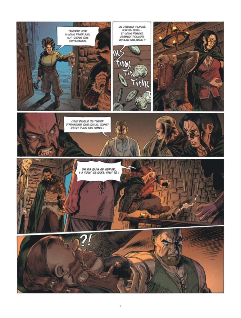 Parue aux éditions du Lombard, cette bande dessinée au format classique, franco-belge, se lit d’une traite d’abord. Puis se relit tranquillement vignette par vignette, embarqué par une mise en page efficace, propice à une lecture limpide, et surtout pour profiter du combo dessins et couleurs. J’ai trouvé remarquable le travail sur les ambiances. Les couleurs des éclairages, à la bougie dans l’auberge, à la torche lorsque la compagnie de Tano progresse dans les souterrains de la ville de Brenhaven ou encore celles des couchers et levers de soleil participent largement à la réussite de ce premier opus. Encrées sur les dessins réalistes de Bruno, ce sont les peuples de ce monde fantastique et leurs émotions qui prennent vie. Les décors sont très travaillés, qu’il s’agisse des villages humains comme de la Sylve, zone de forêt elfique interdite… Il en est de même pour les tenues, les armures, les bijoux… et jusqu’au pelage des chevaux de trait !