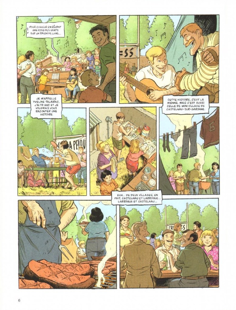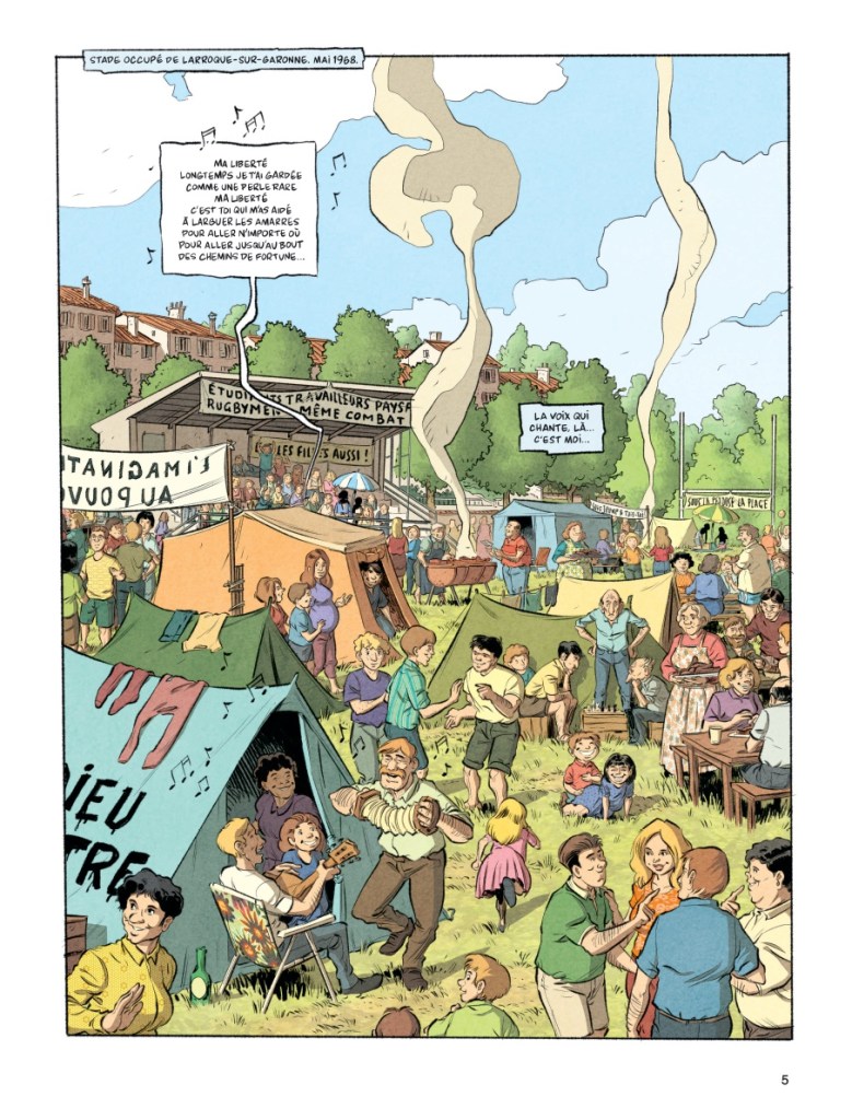 Largement imprégné de leurs vécus respectifs, Aude Mermilliod et Jean-Louis Tripp au scénario, nous offrent un instantané sensible et positif de leur berceau, le Sud-Ouest, terre de rugby, à la fin des Trentes Glorieuses. L’histoire s’ouvre sur le stade de Larroque-sur-Garonne, village voisin et presque jumeau de Castelnau. Il est occupé par une multitude de personnes, en musique, dans un joyeux bazar de toiles de tente, de grillades et de discussions sourires aux lèvres ; une banderole annonce la couleur « étudiants, travailleurs, paysans, rugbymen, même combat ». Nous sommes en mai 68 et Yveline s’apprête à nous conter ce qui l’a menée là ! Retour donc à l’été 67…