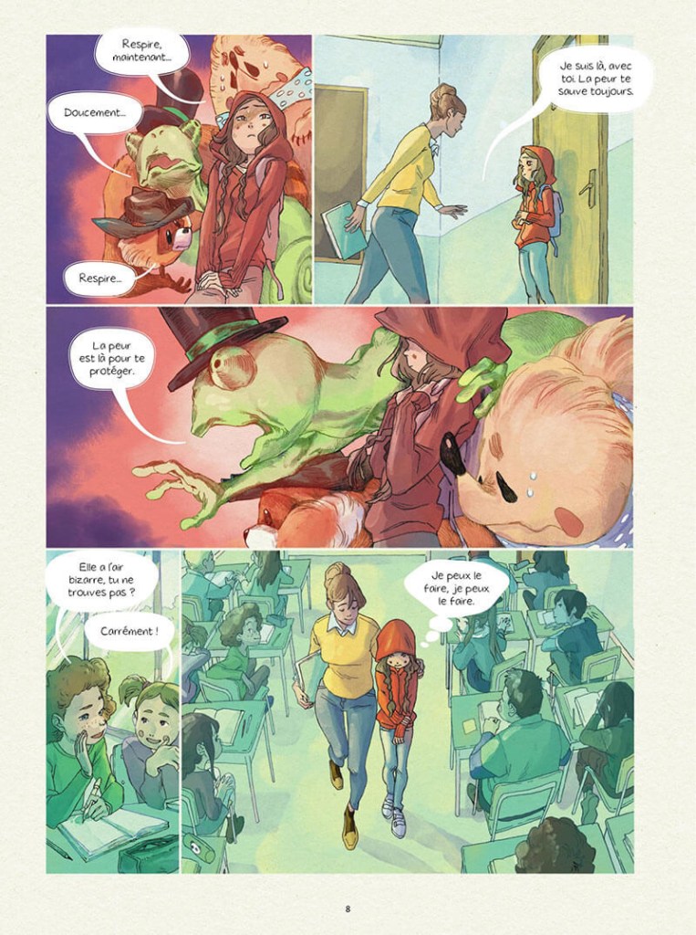 Dés la superbe couverture étoilée, une certaine tension est perceptible, dans le regard de l’héroïne et dans le cadre, bleu foncé, où un regard plus attentif découvrira des objets sans dessus dessous. Le trouble dissociatif de Gaëlle est subtilement traduit par des nuages sombres, des hachures, venant ponctuellement assombrir sa clairière de rêve, très colorée. Le noir et blanc prend même le dessus le temps de doubles pages très fortes. Le contraste entre les moments légers et la noirceur engluée qui avale la patiente est saisissant. Pour mieux laisser la place, à nouveau, au positif et au multicolore. Chaque lieu est un régal de prairie fleurie, de palmiers exotiques sous un crépuscule rosé, de rivière enchantée, de mignonnes créatures et de lanternes magiques… Les amis de Gaëlle ont l’élasticité et l’énergie de l’enfance, ainsi qu’une loyauté sans faille. C’est normal, ils la rendent unique ! Et ils font partie d’elle…