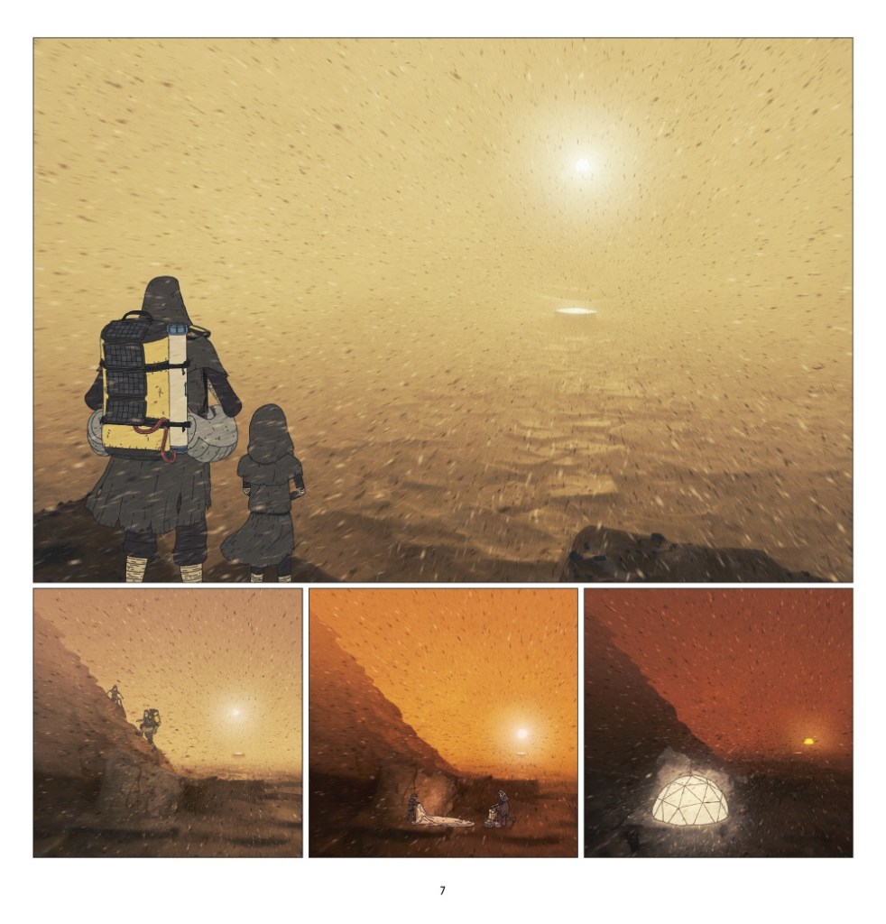 Le dessin est réalisé à la tablette graphique, selon des techniques d’animation parfaitement maîtrisées et des choix de couleurs affirmés. Les personnages ont un côté comics, avec des astronautes aux peaux de différentes couleurs. le format carré est généreux, il laisse le temps de s’immerger dans les ambiances du vaisseau comme dans celle de la planète sableuse, balayée par les vents et comme photographiée. L’ensemble forme un style unique et accrocheur, très lisible et dépaysant. Les dialogues nous plongent dans la peau des personnages, les actions sont fortes, de quoi dévorer l’album avec une goutte de sueur sur le front.
