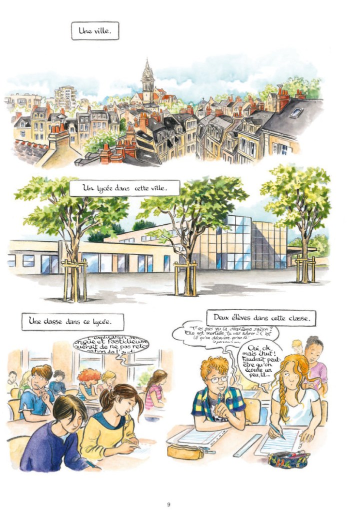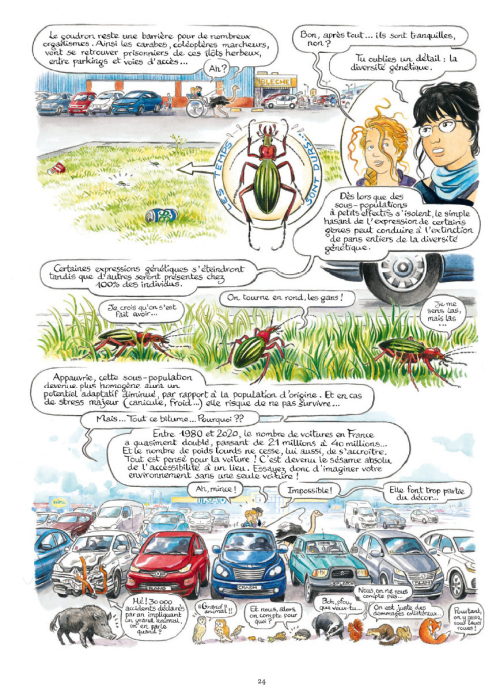 Deux lycéens partent en exploration de leur environnement pour préparer un exposé sur la 6ème extinction. Démunis, ils reçoivent l’aident de plusieurs scientifiques chercheurs du museum, passionnants : une écologue les amène découvrir la richesse de la biodiversité et de nos interactions avec elle. Allez, hop, ils embarquent dans une carriole tirée par une autruche, puis continuent en vélo, et à cheval ! Il faut dire que l’action de l’humain est multiple : énergie, transports, alimentation… Petit à petit, certaines espèces sont menacées, d’autres au contraire s’adaptent au point de devenir envahissantes ou nuisibles… La spécificité des milieux diminue. Un paléontologue fait ensuite traverser les ères géologiques aux enfants, afin de démontrer que les crises sont de longs déclins de la biodiversité. L’exposé sera brillant, mais risque d’être déprimant… Heureusement, un murmure grandit un peu partout, fait de toutes les actions positives !