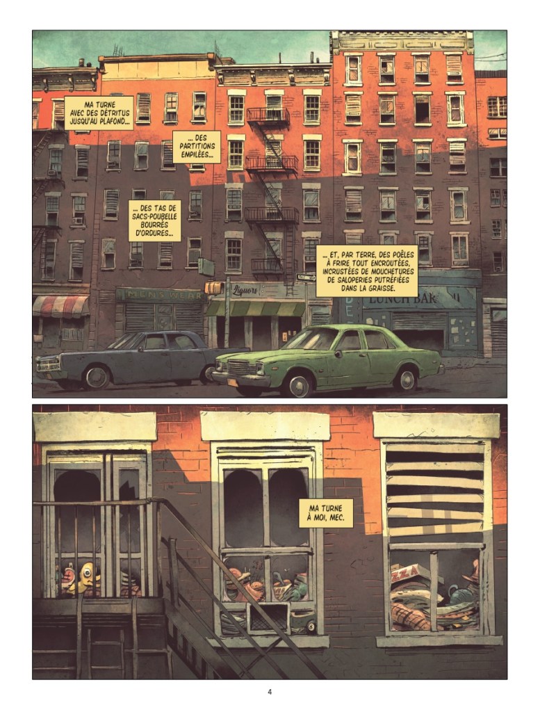 Son lieu de vie n’est pas sans rappeler les intérieurs bien glauques visités lors de la précédente série des deux auteurs. Le lecteur ne sait pas à ce stade à qui il a affaire. A-t-il toute sa tête ? Est-il dépressif, psychotique (il doit se reposer dix minutes après s’être levé, il éprouve de grandes difficultés pour sortir de chez lui et souffre des tocs de vérification) ?