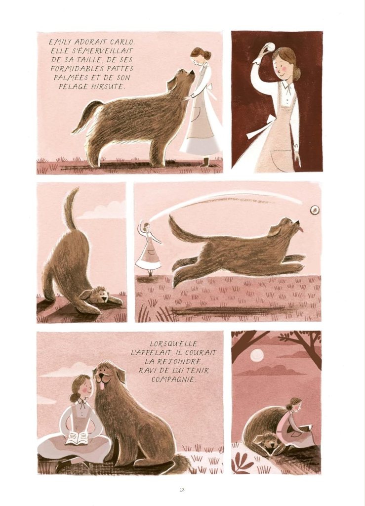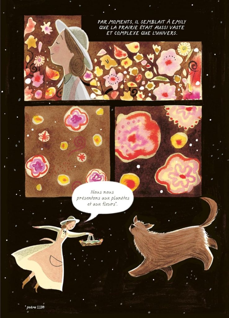 Ouvrage destiné à la jeunesse, « Le jardin d’Emily » est une parenthèse douce aux dessins naïfs et tendres où l’on suit Emily-fleur sauvage du Manoir parental d’Amherst, dans le Massachusetts, aux plaines et forêts environnantes. Après quelques pages introductives pour illustrer l’attrait d’Emily pour la botanique, l’autrice nous entraine dans une journée imaginaire de pérégrinations à la recherche de spécimens floraux pour enrichir son herbier. Au côté de Carlo, son chien fidèle et protecteur, c’est toute la nature qu’emmagasine la demoiselle en sa mémoire poétique : coucher de soleil et bruissement du vent, bourdonnement des insectes et fraicheur des bosquets…