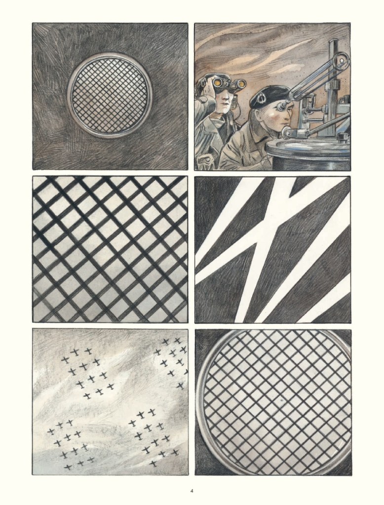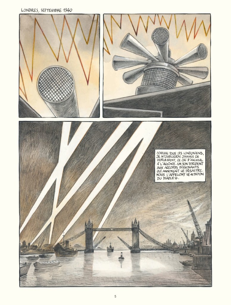 La partie contée apportent la juste dose de douceur à l’album, par de très riches couleurs. Les scènes de bombardement sont littéralement à couper le souffle, avec quelques scènes très dures, mais parfaitement exécutées. Un crayonné noir vigoureux souligne les scènes intenses d’aviation, de nuit, la fumée, les décombres. En contraste, la plongée dans l’imaginaire offre, au sein de planches très généreuses, un univers magique, poétique, incroyable. Mary suit un chat tigré, qui nous fait un joli clin d’œil au Chat du Cheshire d’Alice, avec ses rayures colorées et ses yeux malicieux. L’aquarelle en couleur directe enflamme les cauchemars de Mary comme la grande ville. Mais les influences de Grenson lui viennent aussi du cinéma. Et si les oiseaux ressemblent la nuit à ceux d’Hitchcock, ils seront avec les arbres source de résilience et retour à la paix.