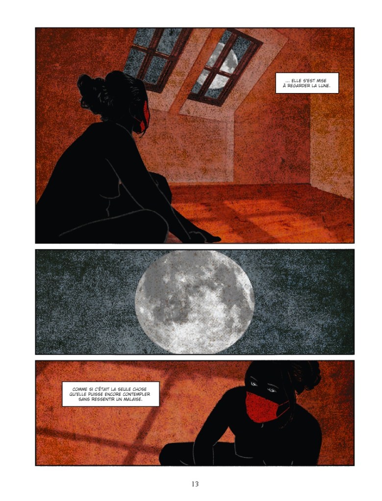 Philippe Squarzoni nous a déjà habitué à son style unique, très travaillé, impeccable, où la superposition d’images, parfois chocs, permet au cerveau d’associer librement ses idées tout en le guidant. Le passage à la couleur apporte encore plus de force à ce procédé. Le noir et blanc vient dialoguer avec un rouge sang, symbole évident de danger. J’y vois aussi une couleur terreuse, un rappel du sol auquel il nous faut se ré ancrer. L’angoisse est palpable, lorsque la femme est nue, masquée, à terre, ou prisonnière de fils invisibles. Les images du quotidien nous rappellent des réalités autant tues que crues, l’exil de personnes pour leur survie, le labeur des travailleurs invisibles. L’iconographie militante, du combat, gilets jaunes et poings levés, n’est pas oubliée, ni celle d’une nature fragmentée, de vies parfois vides de sens, de menaces prenant le visage de Trump comme des désordres climatiques. Rarement le jeu du découpage n’aura été si loin, le texte devenant case, la vignette se réduisant à une particule d’un corps, des naufragés s’égarant au-delà d’une case, et le corps de la protagoniste traversant les pages en apesanteur. C’est à couper le souffle, et c’est bien de cette fonction vitale qu’il s’agit : respirer, pouvoir retrouver du souffle.