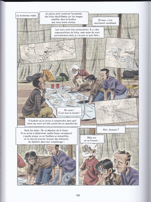 Séverine Laliberté est archéologue au CNRS et scénariste de bande dessinée. Avec cet ouvrage publié par Steinkis éditions, elle invite les lecteurs à suivre le quotidien d’une équipe internationale d’archéologues. Ce collectif, constitué de géoarchéologue, spécialiste des fumiers fossiles (Jacques), géographe, cartographe, géologue archéozoologue, étudie les Kites, des gigantesques et étranges constructions, oubliées depuis des siècles et que l’on retrouve de l’Arabie Saoudite au Kazakhstan en passant par l’Arménie et la Syrie. Les chercheurs s’interrogent sur leur fonction : s’agissait-il d’enclos pour l’élevage, de piège pour la chasse ? Les murs de ces « constructions » peuvent être longs de plusieurs kilomètres et questionnent sur leur forme uniforme dans des lieux désertiques.
