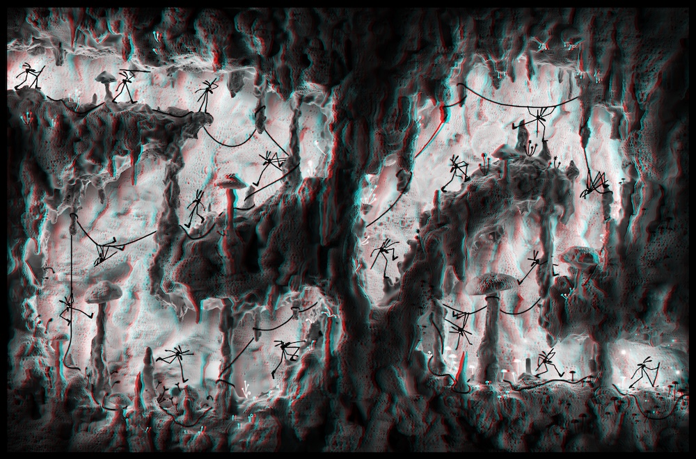 Il y a quelque chose de magique dans le modus operandi de cet auteur qui expérimente ici les anaglyphes par la photographie, un procédé aux origines de la 3D qui s’obtient en superposant deux images légèrement décalées et qui s’observe avec des lunettes aux filtres rouge et bleu. Le dispositif décrit dès 1853 par Wilhelm Rollmann offre un rendu saisissant. Pour cette aventure, l’illusionniste a utilisé pas mal de matériel, construit, moulé et glané beaucoup d’éléments à l’origine de ses décors inventifs.