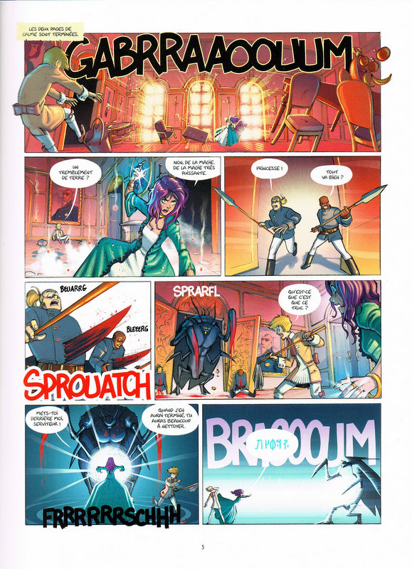 Dès la première page, le lecteur est prévenu : la paix entre les trois royaumes voisins est fragile, et elle ne va pas durer longtemps : deux pages exactement ! Vous l’aurez compris, nous embarquons pour une aventure qui, si elle ne sera pas tranquille, adoptera résolument le ton de la dérision. C’est donc avec le sourire que nous découvrons les personnages centraux de l’intrigue. La puissante princesse Tatiana de Valania, ainsi que Meeri, jeune garde timide et très habile, très attachée à Aether, un serviteur du même âge charmant et insouciant. Alors que ce dernier arrive dans les appartements royaux, une explosion retentit – de la puissante magie ! Et soudain, des insectes géants transpercent les soldats en faction ! Alors qu’ils semblent résister aux attaques classiques comme magiques, Aether décroche une épée ensorcelée qui s’avère très efficace. Mais le trio est cerné.. Heureusement, un vaisseau arrive. Opale Sergens, capitaine du haut de ses 18 ans et bricoleuse de génie, s’avère prête à sauver le groupe, de manière totalement intéressée. Et il va falloir protéger Aether, novice en combat, puisque l’épée a choisi son maître… La princesse parviendra-t-elle à récupérer son royaume ? Opale peut-elle devenir une alliée fiable ? Une concurrence va-t-elle s’installer autour du seul jeune homme de l’affaire ? Et d’où viennent les insectes destructeurs ? Je vous laisse le soin de plonger dans cette intrigue haletante et embarquer pour les trois contrées !
