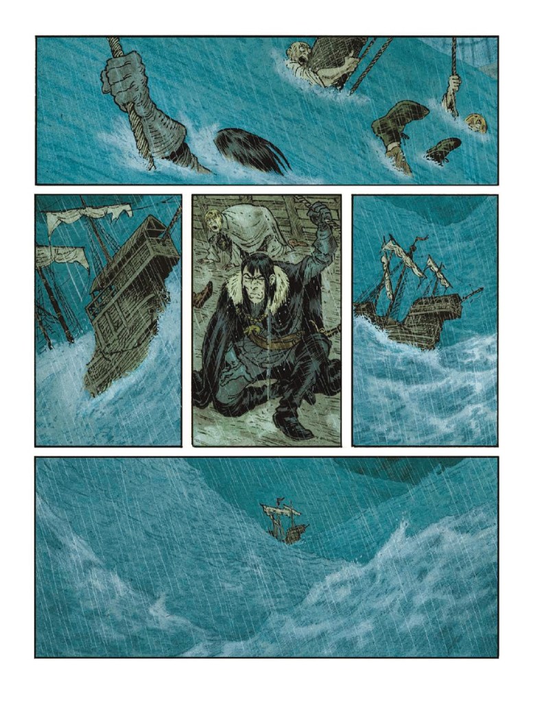 Ils naviguent en direction du Groenland, le Graal de Dom Mathias un missionnaire en quête de croisade et de reconnaissance accompagné d’un redoutable anglais au sarcasme facile aussi maléfique et méchant qu’ambitieux et irrésistible. Arrivé à destination, l’équipage trouve une armée défraîchie, une garnison de fortune . Une narration en cinq actes se dessine alors. Pleine de rebondissement, elle nous aspire littéralement, nous désarçonne et nous happe. Impossible alors de ne pas aller jusqu’à la fin grâce à une intrigue tonitruante.