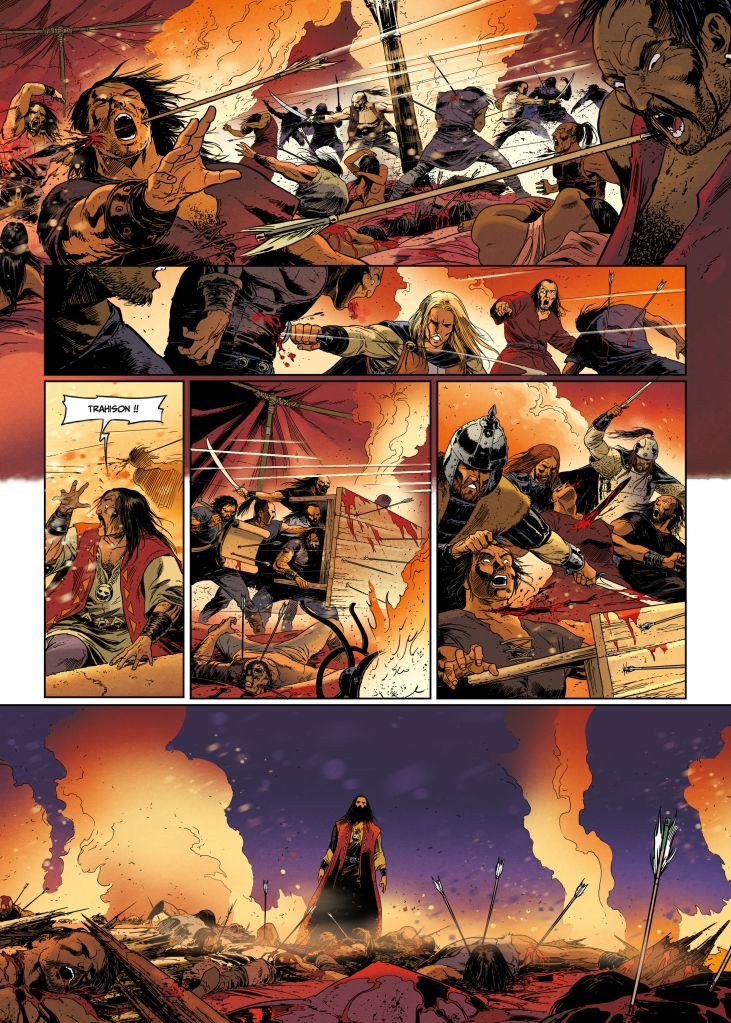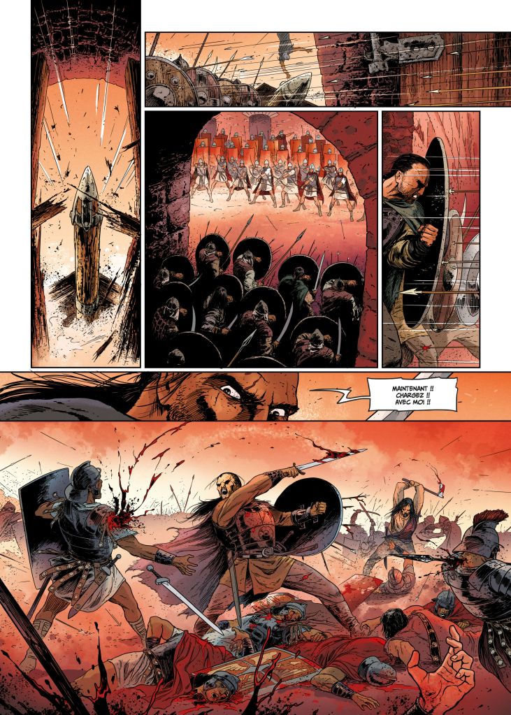 La prestation graphique de Dragan Paunovic est éblouissante. Son découpage est une démonstration, qui se démarque par les nombreuses cases panoramiques, rectangulaires parfois horizontales voire verticales employées. Une sensation d’ordre de maîtrise qui contraste habilement avec les scènes effroyables et le déchaînement de rage et de colère qui transpire du champs de bataille. Les affrontements sont monstrueux. Le dessinateur joue avec les cadrages, il fait preuve d’une technique affûtée qui nous laisse une forte impression.