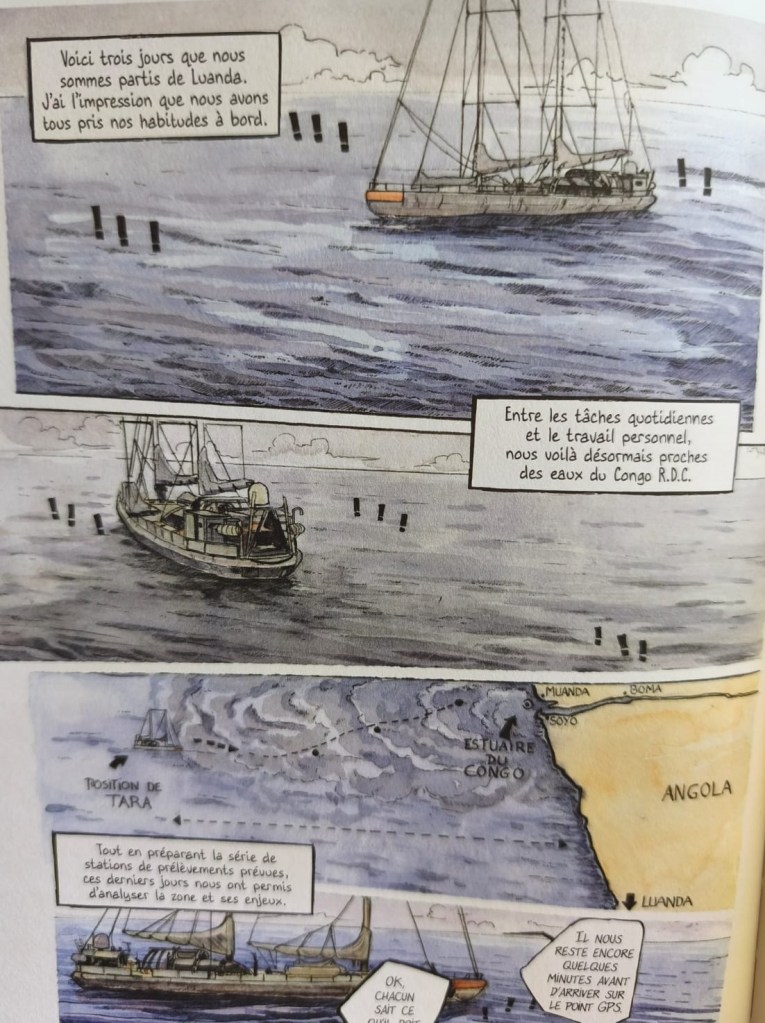 Les scientifiques embarqués dans ce «laboratoire des océans» parti de Lorient et financé par la fondation Taraocéan (première fondation reconnue d’utilité publique consacrée à l’océan en France. ) ont pour mission d’étudier le microbiome marin et analyser l’impact de la pollution plastique sur ce dernier. Les chercheurs examineront plus précisément, en compagnie de l’auteur, les eaux fluviales du fleuve Congo. Le dessinateur et scénariste rejoint l’équipe à Lunada, la capitale de l’Angola.