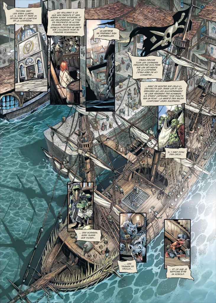 Ainsi donc, après avoir été happée par la couverture très engageante de cet album, j’ai fait la connaissance du monde d’Arathéon, ensemble d’îles plus ou moins vastes, aux patronymes marqués par des consonances celtes et vikings et fleurant bon le rhum et l’eau de mer. L’océan y est omniprésent et cœur de luttes opiniâtres : en Arathéon, qui possède les routes maritimes, possède le pouvoir. C’est dans cet univers que l’on suit Agora, jeune fille soumise aux éléments comme à sa destinée. Sur sa route, un pendentif, un orc couvert de runes tatouées, la Lanterne, vaisseau de flibustiers mené par l’odieux capitaine Blackthorn, de la magie à tendance sérieusement nécromantique, des enjeux politiques enchevêtrés en toile de fond, et beaucoup, beaucoup, beaucoup d’envies vengeresses ! La damoiselle n’est pas du genre à se laisser faire. Ça dépote du début à la fin, un rythme de narration enlevé, des traitrises et faux-semblants à qui mieux-mieux, des cartouches placés idéalement pour une compréhension idoine, le tout servi par une illustration brillante et une mise en page dense, et pourtant claire et cohérente.